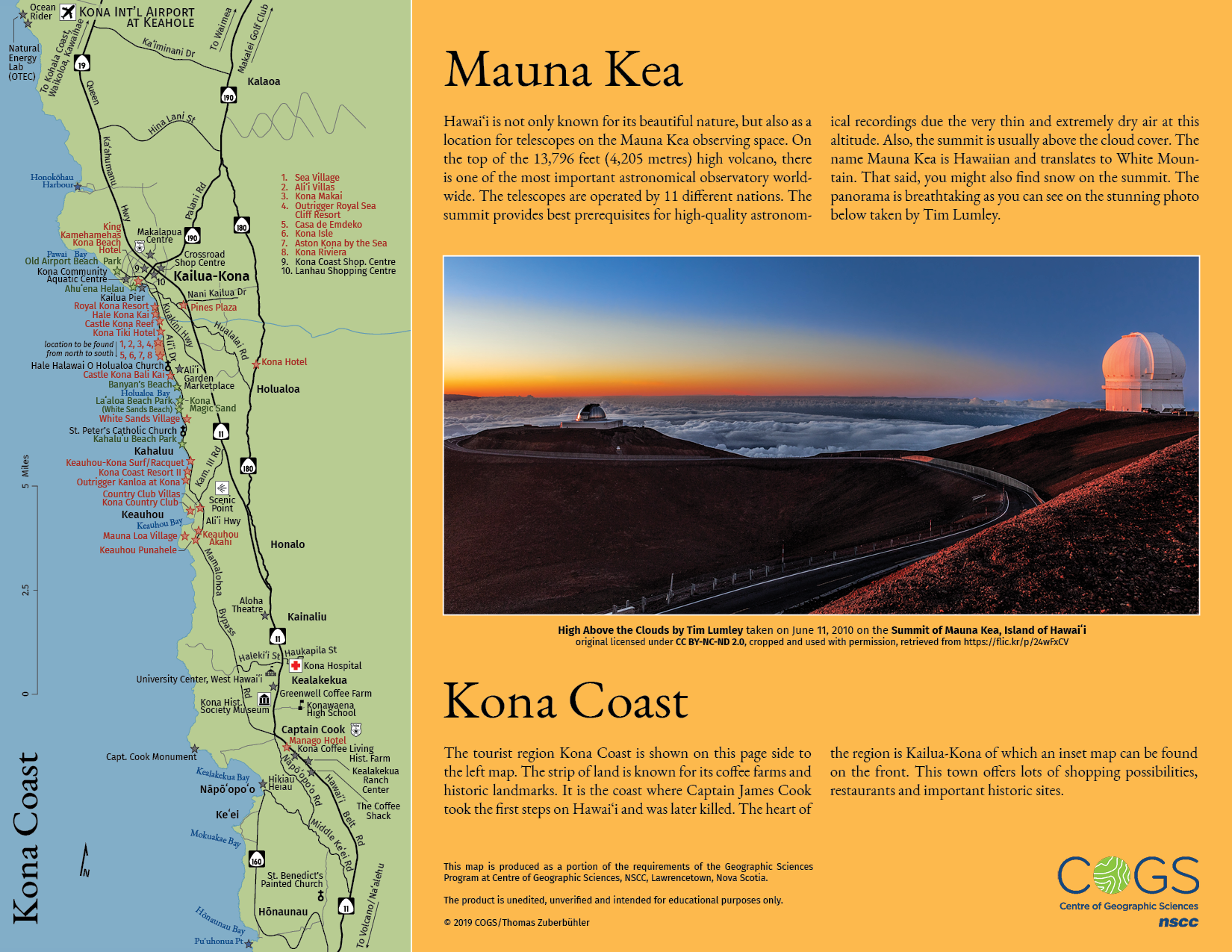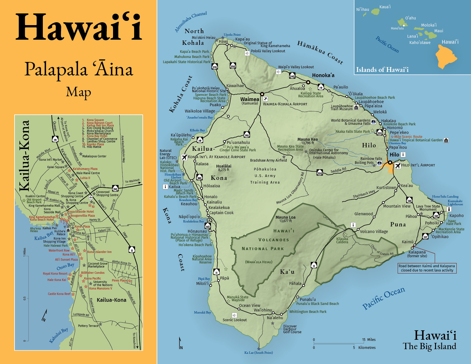 Based on the provided Adobe Illustrator files containing streets, landmass and a few of the required point of interests, along with an inaccurate map of the Big Island (Hawaiʻi) and a relief of the island, I was asked to produce a folded tourist brochure with two inset maps and a text panel as a portion of the requirements of the Geographic Sciences Program at the Centre of Geographic Sciences.